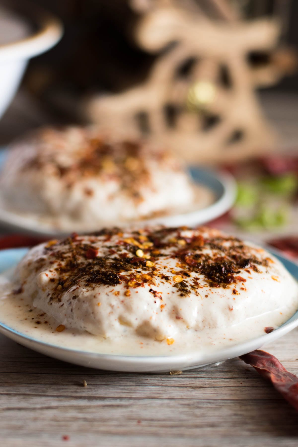 - Place the Vada in a serving bowl and pour the yogurt mixture as needed, evenly over the Vada's, covering them completely.